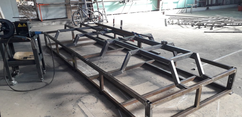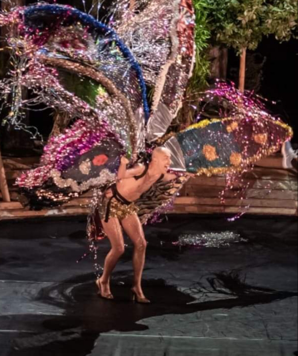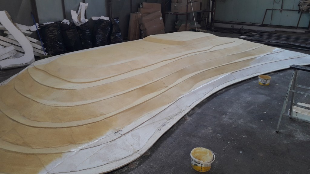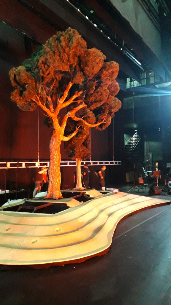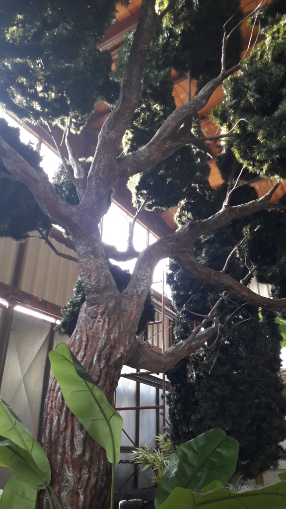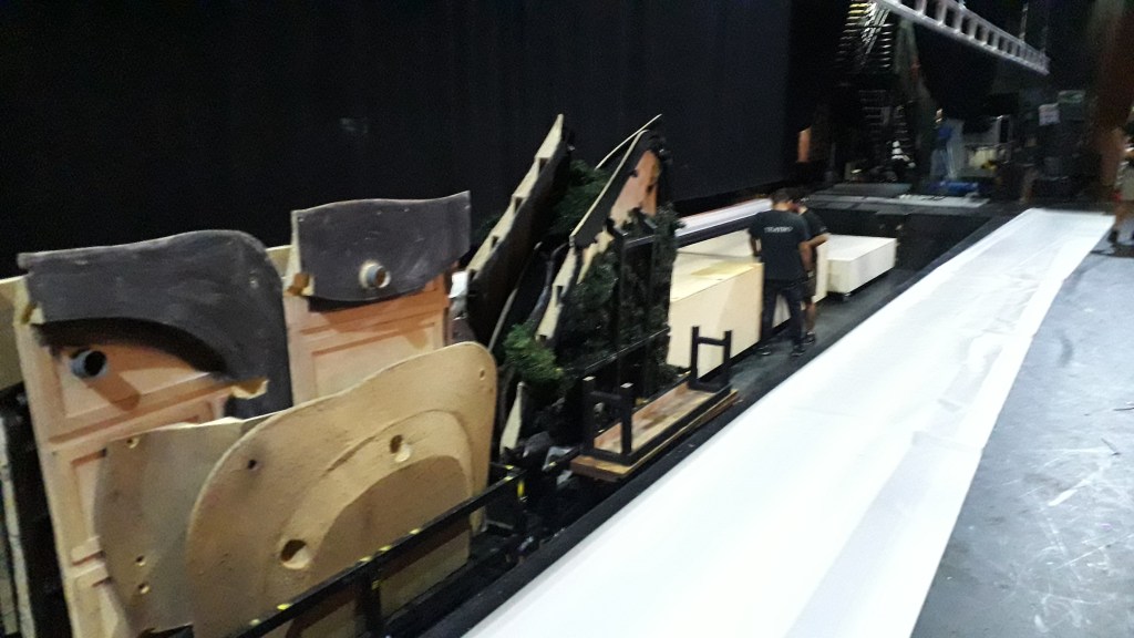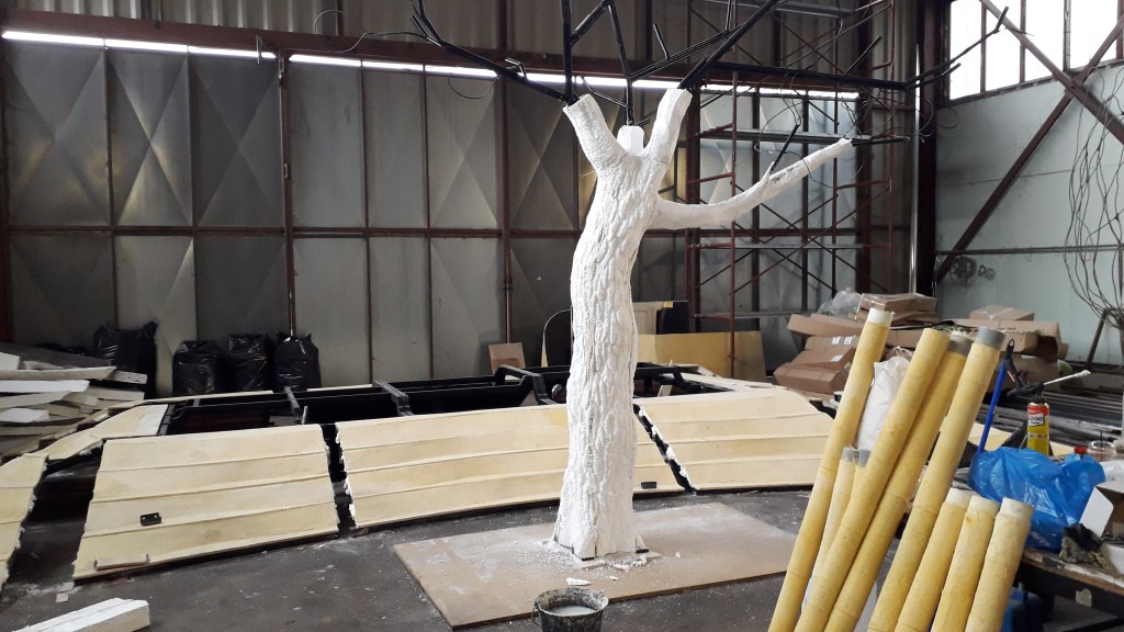 It took two months to complete, with the instructed assistance of another three artists for a period of three weeks. Steel, poplar plywood, polystyrene foam, pvc pipes and heat resistant acrylic resin, were the materials used and together with the foliage the total weight of the set came to 1,5ton. The set stands on wheels and the base becomes two carts that carry the set.